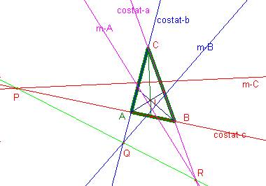 prolongacions dels costats oposats en 3 punts alineats.