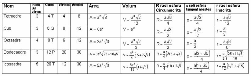 Els poliedres regulars o platònics són els poliedres convexos en què totes les cares són polígons regulars i l’índex de tots els vèrtexs és igual. Els poliedres regulars són 5: el tetraedre, el cub o hexaedre, l’octaedre, el dodecaedre i l’icosaedre. Els poliedres regulars tenen una esfera circumscrita (que passa per tots els vèrtexs) una esfera inscrita (que passa pels centres de totes les cares) i una esfera tangent a totes les arestes en els seus punts mitjans. Dades dels poliedres regulars. Els