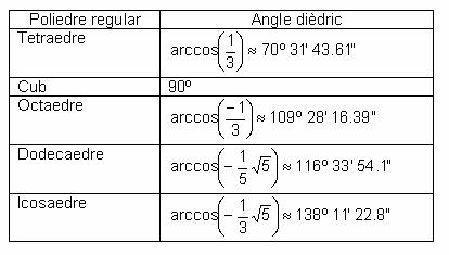 radis de les tres esferes acompleix que tangent a les arestes és mitjana geomètrica dels radis de les esferes incrita i circumscrita al poliedre. Els angles dièdrics dels poliedres regulars són: Dualitat dels poliedres regulars: