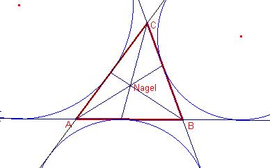 En un triangle les rectes que uneixen els včrtexs amb els punts de tangčncia dels circumferčncies exinscrites (en els costats oposats), s’intersecten en un punt anomenat de Nagel.