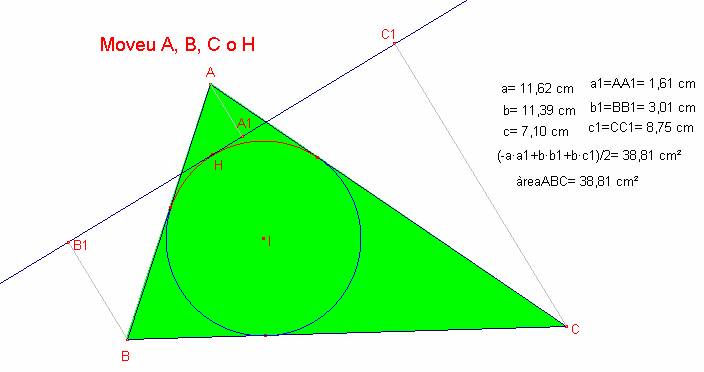distàncies (a1, b1, b2) dels vèrtex A, B, C a una tangent al cercle inscrit pel