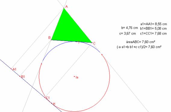 distàncies (a1, b1, b2) dels vèrtex A, B, C a una tangent al cercle exinscrit
